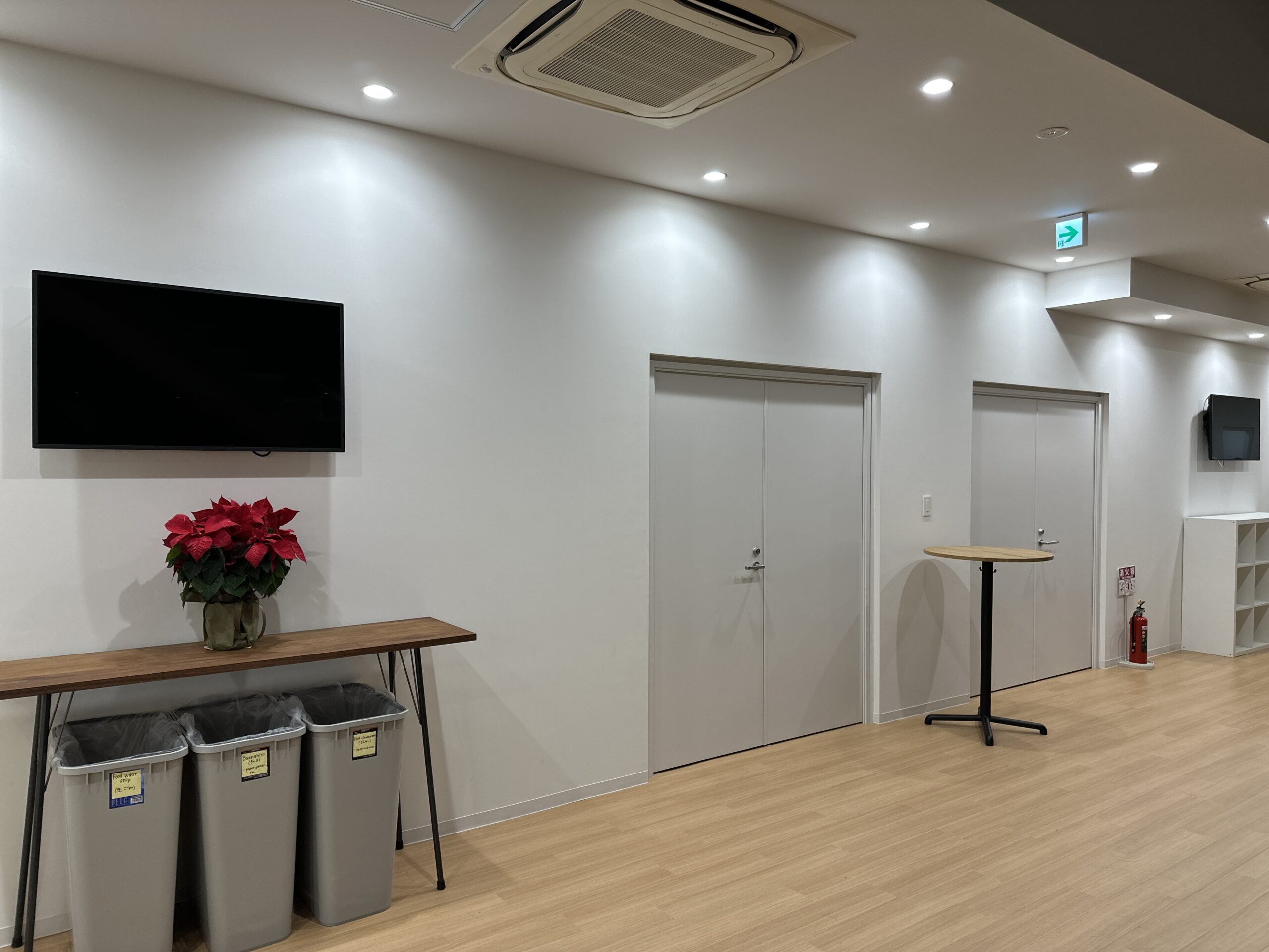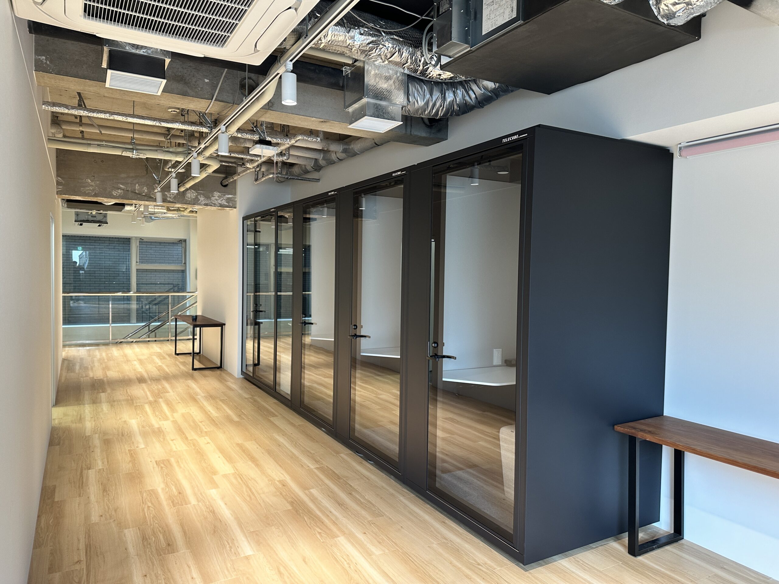 木目と白で全体を構成して2つの異なる目的の空間の統一感を演出いたしまして、原宿駅近くの竹下通り脇の周辺事情も考慮して完工までに段取りを調整しました。