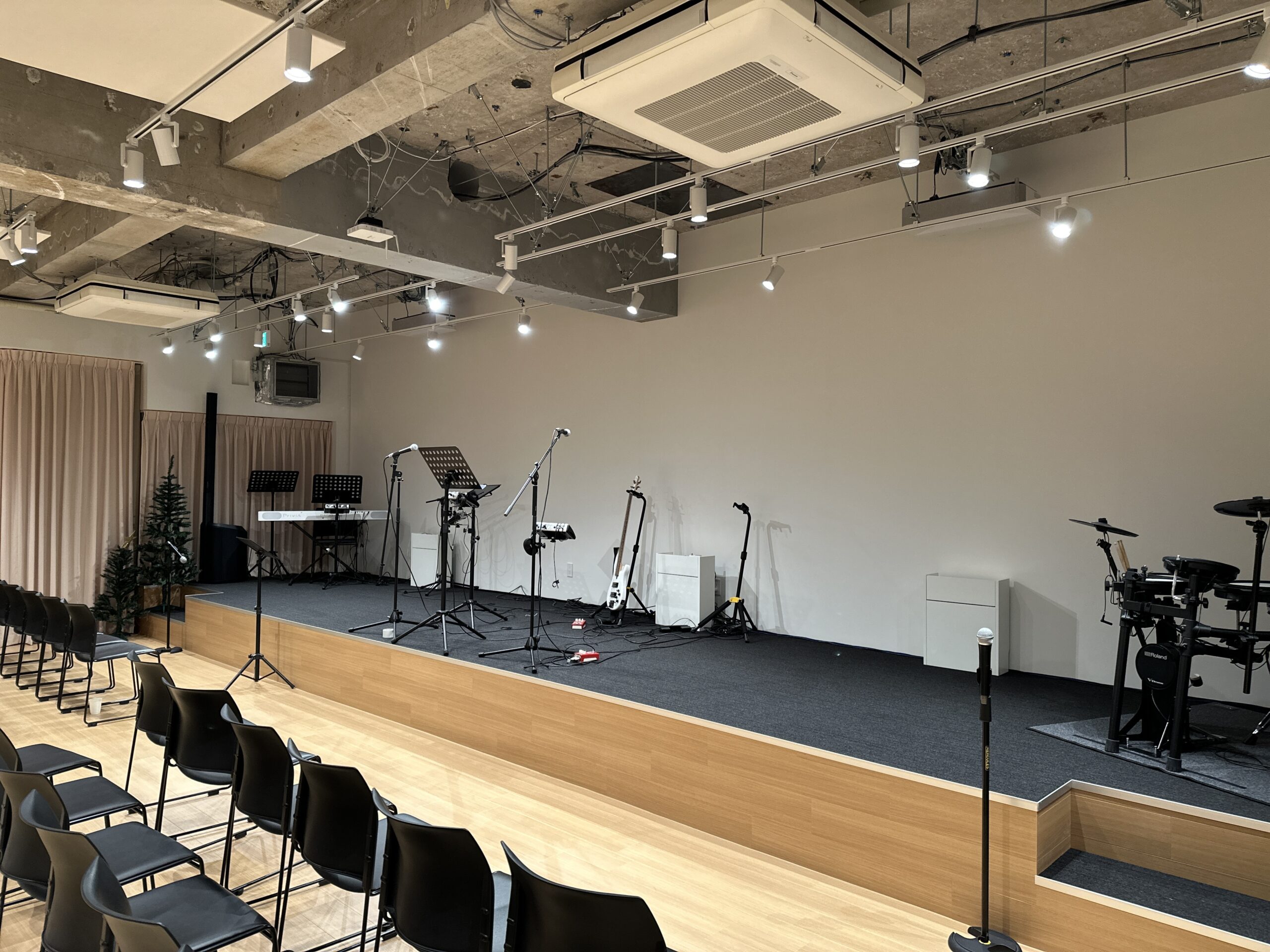 B1Fのマスタードシードチャーチは荘厳で厳粛な教会像ではなく、誰もが気兼ねなく来られるような親しみやすい誰もが受け入れやすくなるようなキリスト教を伝えられる空間を作りました。当初は空調や天井、照明などもない空間でしたが、全体の雰囲気の調整をしつつ、演奏や聖歌隊、ミサにも耐えられるような防音対策を施し、街の周囲に配慮した原宿の目玉スポットになる施設の建立に力添えができました。